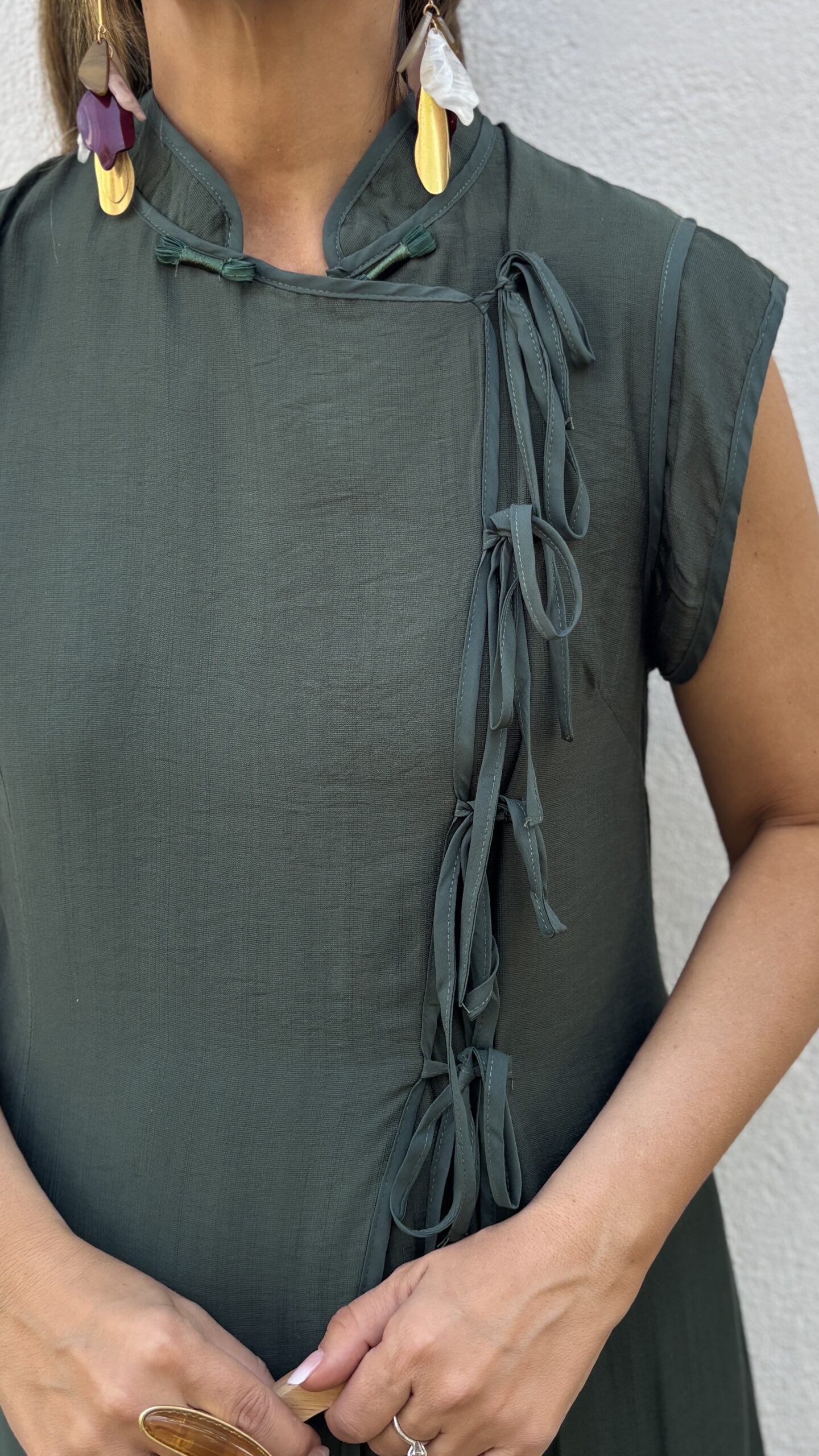 Conjunto dos piezas : se compone de un pantalón con goma elástica en toda la cintura y una túnica Blusa larga detalles de alamares y lazadas